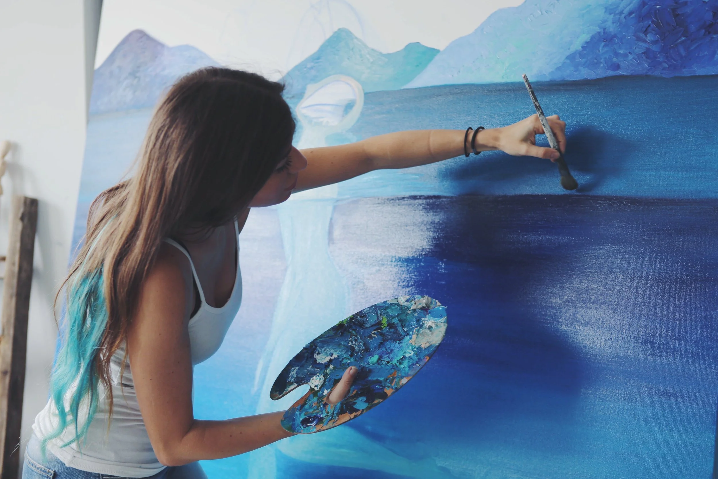 Eva’s work often explores themes of ecology, feminism, lucid dreaming, and the subconscious, transforming collective pain into intimate spaces of beauty and care. She moves fluidly between painting and multi-sensory environments that integrate sound, scent, light, and participatory processes.